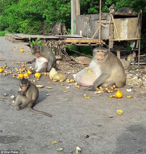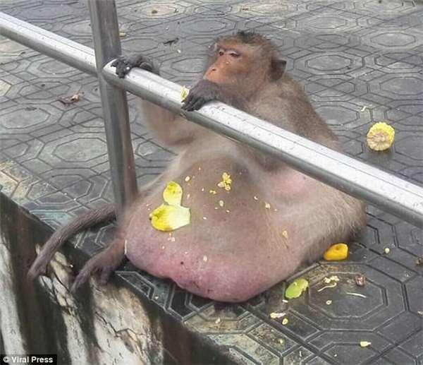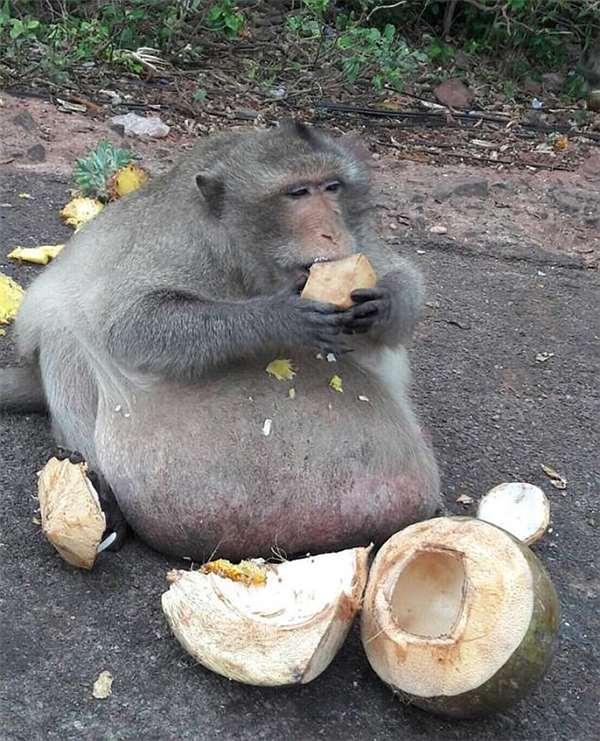 久而久之讓猴子中的大哥吃成了這副模樣,你沒看錯!儘管他已經吃到肚子都垂在地面上了,牠依舊馬不停蹄的吃著周圍的人們奉上的食物。