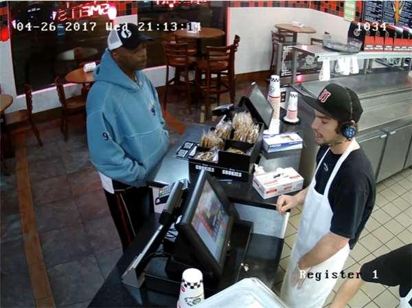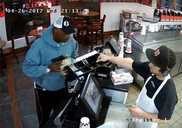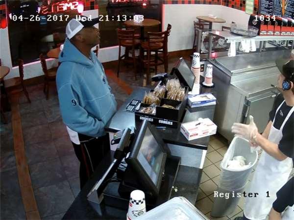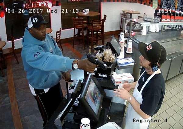 整起搶案發生於上週三(4/26)晚間9點左右,一名身著淺藍色運動衣的黑人男子,進入連鎖速食店《Jimmy John's》內佯裝顧客點餐,等待時間成熟後馬上從口袋中掏槍行搶,要求店員把收銀機內的現金全數交出。