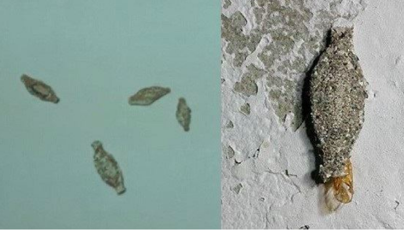 在牆壁上可見到一個黏著水泥的紡鎚形絲袋,內有一深褐色頭的幼蟲。