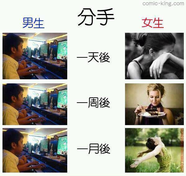 女生短時間內傷痛大於男生,但男生反而會在很久之後仍然會有淡淡的傷痛隱隱發作