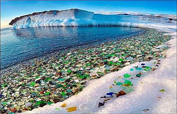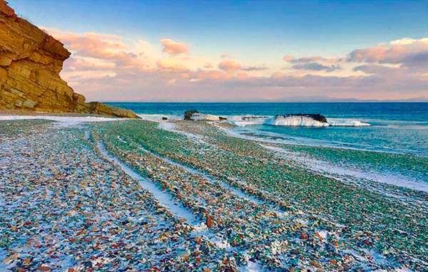 原來在蘇聯時代,這座海灘被政府用來丟棄廢棄的玻璃瓶和陶器,幾乎每天都有數輛卡車來這兒傾倒垃圾,當時這座海灘上佈滿了會割傷腳掌的碎片,當地居民也是避之唯恐不及,連踏都不願踏入海灘,而當局更將此地列為旅遊禁區。