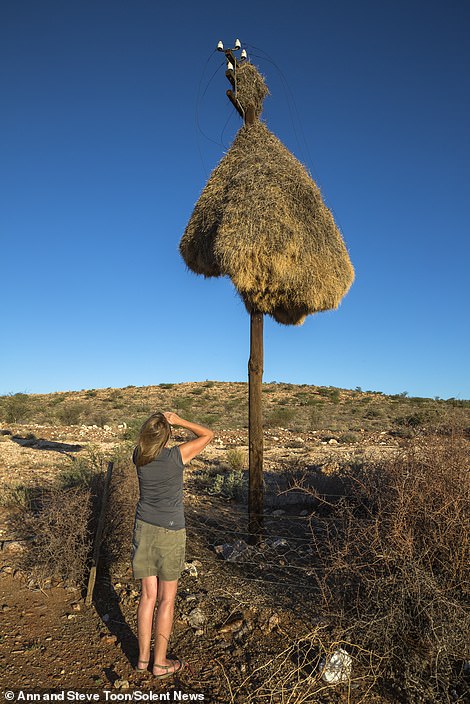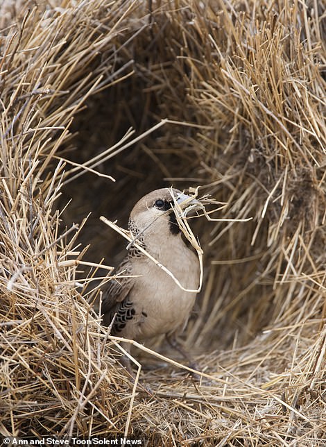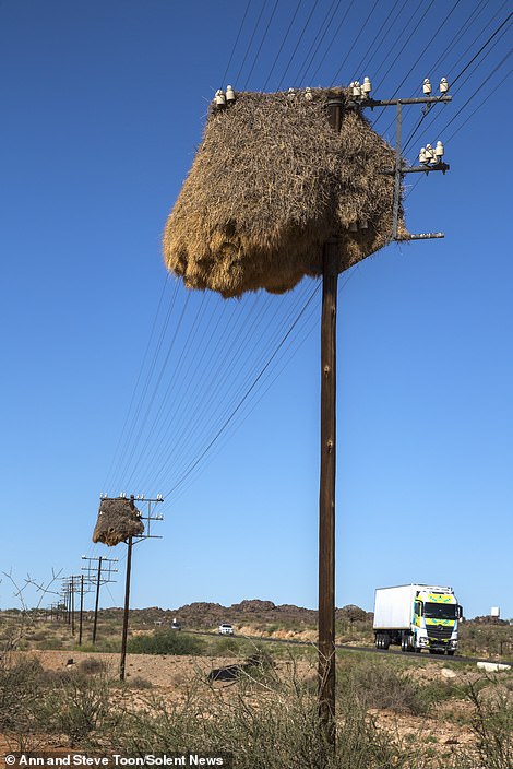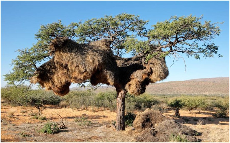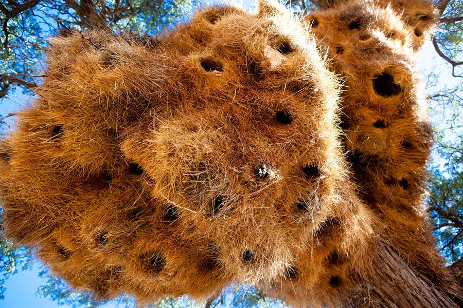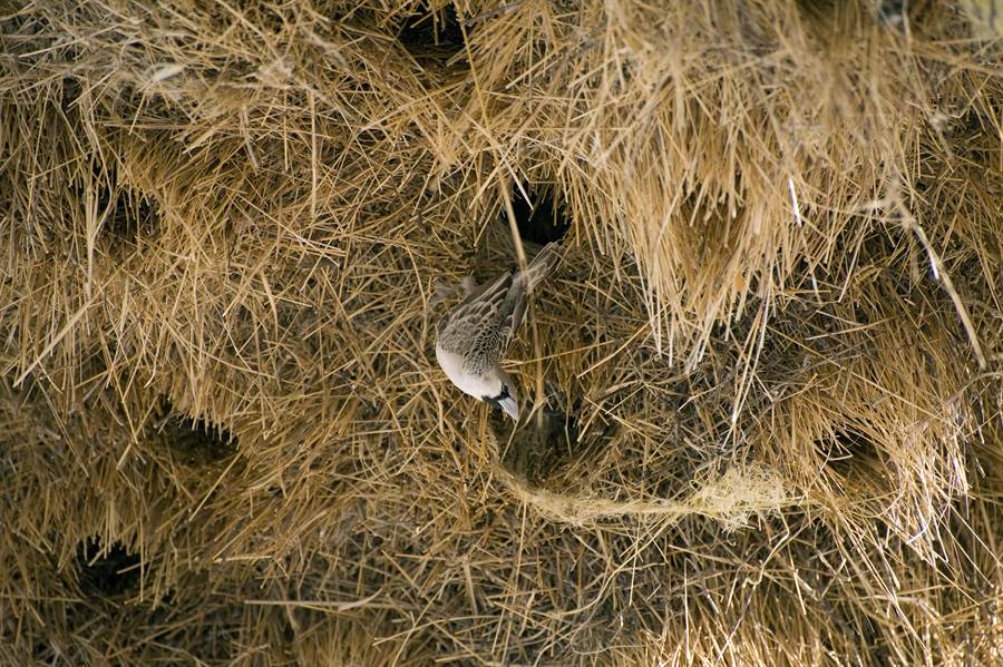 建造這些巨大鳥巢的是身長僅有14公分的群織雀(Sociable Weaver),牠們主要活動於農田附近的草叢中,以灌木的種子或果實為食。