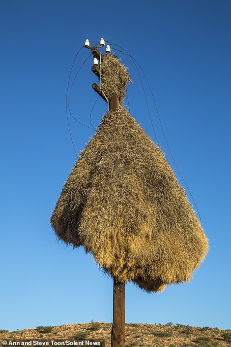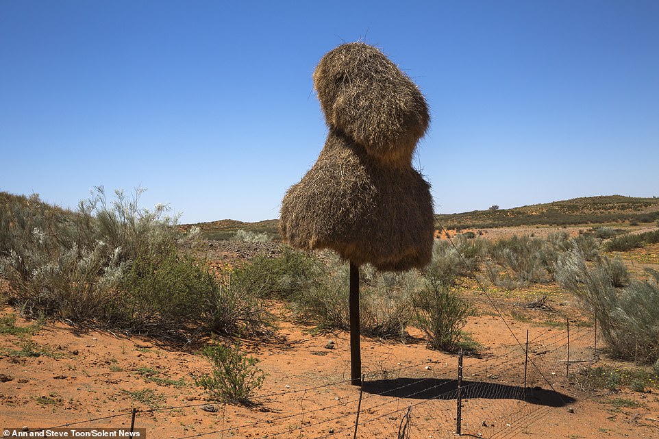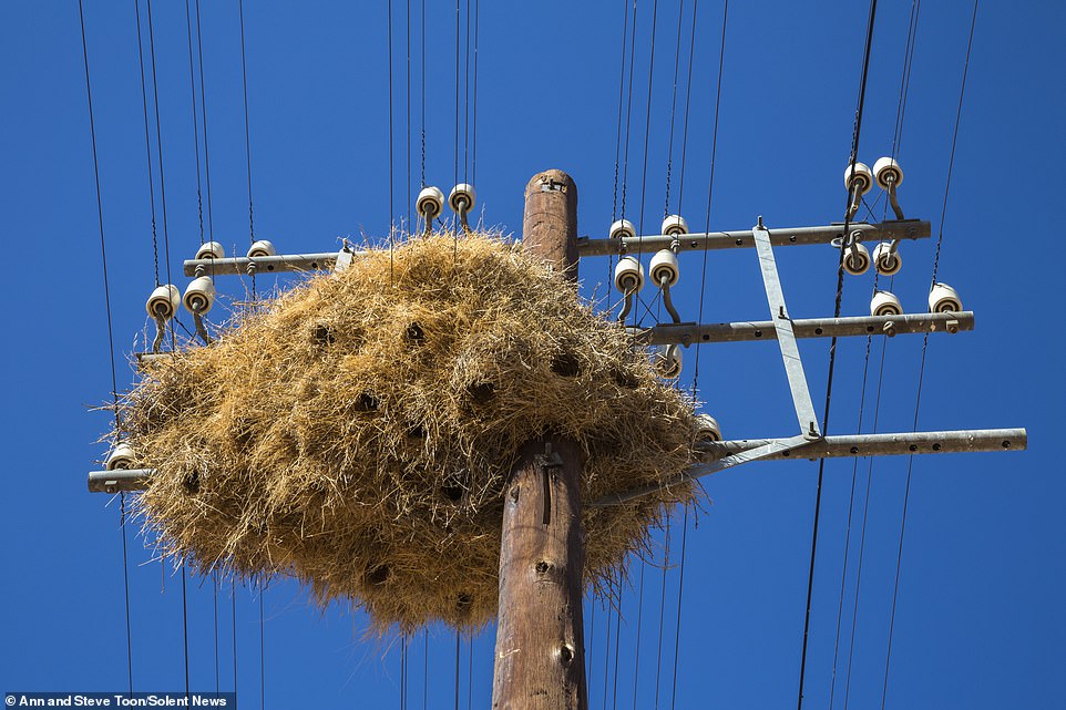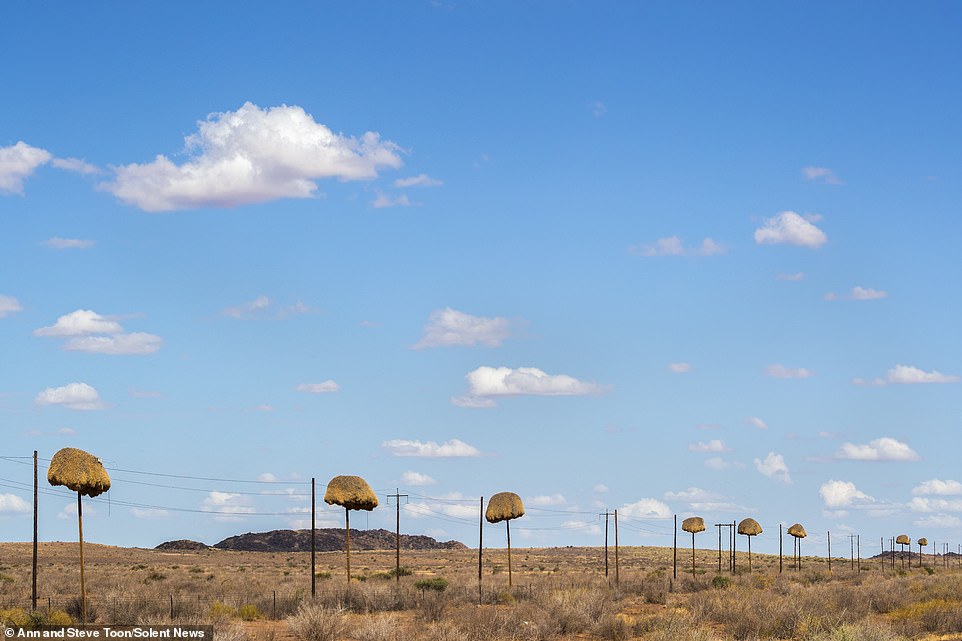 而這次到南非旅遊的時候,他們意外拍下了這些神秘的巨大草團,每個草團都完整的覆蓋了電線桿,看起來就像是有人為電線桿穿上了厚重斗篷一樣。困惑的攝影師夫婦走到草團的底下一看,才發現這並不是無聊青少年的惡作劇!