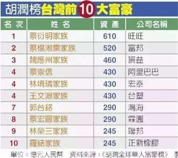 2015年,根據胡潤全球富豪榜的資料顯示,旺旺集團蔡衍明坐擁610億元人民幣的總資產。