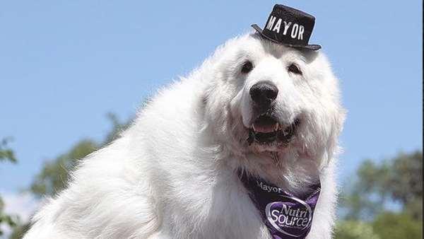 今年才3歲的比特犬布里納(Brynneth Pawltro),去年以「和平、愛與諒解」的競選口號,參與了市長的選舉大戰,後來牠如願打敗了一隻貓咪、一隻雞和一頭驢子等對手,最後以300張選票連任了市長的選舉。