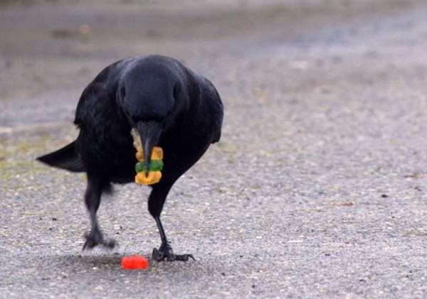 在日本曾有烏鴉將堅果放在馬路上,等待車子把食物碾開,再等綠燈的時候飛下來吃,牠們也會將貝類食物叼至高空往地上砸,而在瑞典也發現烏鴉會趁著漁夫冰釣離開時,拉起釣線,吃掉魚或是餌。