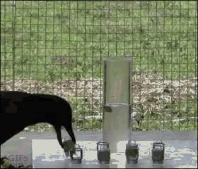 許多人小時候一定都聽過「烏鴉喝水」的故事,內容是這麼說的,有隻口渴的烏鴉找了好久後終於找到一個裝水的瓶子,可惜瓶內的水太少,烏鴉就算將嘴喙伸進瓶子仍喝不到接近瓶底的水,但聰明的烏鴉並沒有因此放棄喝水,牠到一旁的空地叼來許多小石頭放在水瓶裡,最後瓶子裡的水位隨著石頭越來越多逐漸上升,烏鴉也終於喝到水啦!