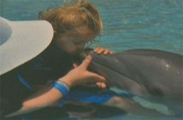 她親吻歡快而溫柔的小海豚,和它們一起在水中無憂無慮的暢游著。