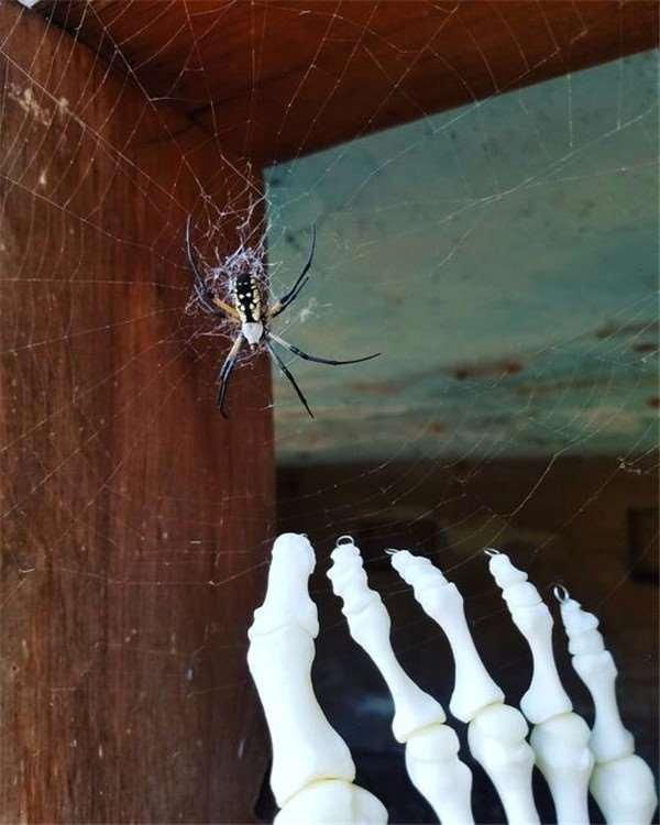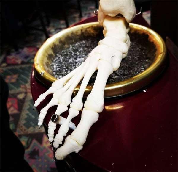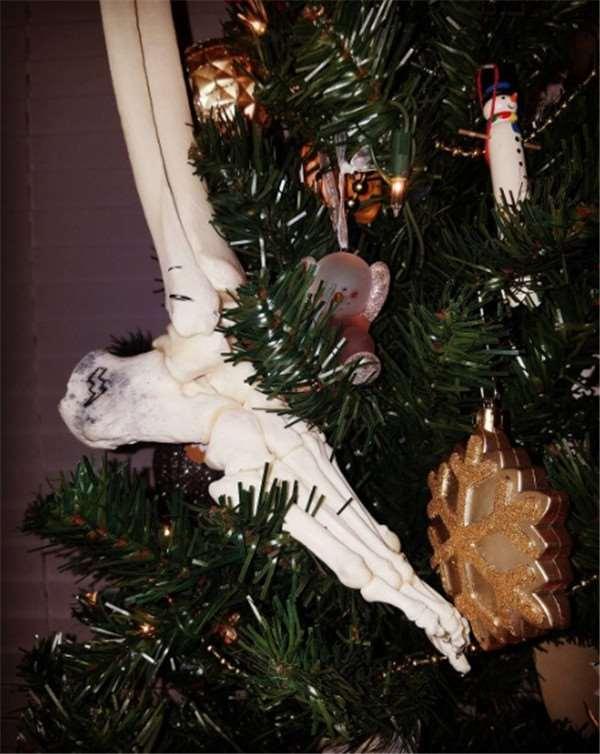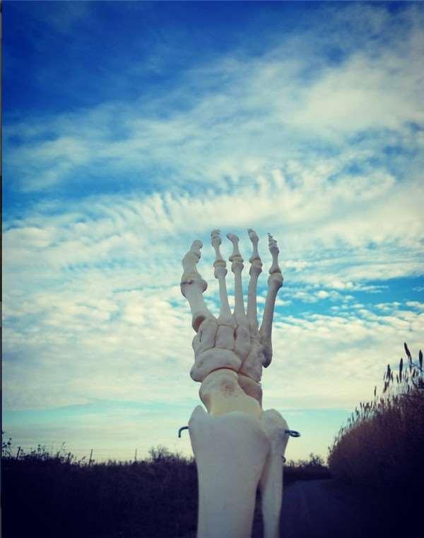 而這圖中被她拿來自拍合影的白骨,正是她自己截下那條腿的腿骨……