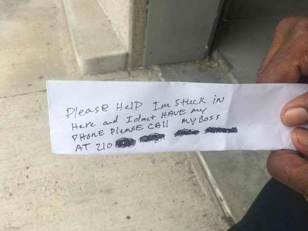 字條上是這樣寫著:「請幫忙,我被困在這裏,沒有電話,請打電話給我老闆……」同時附上老闆的電話號碼。而收到字條的民眾一開始以為是場惡作劇,但也好心的報警處理,負責救援的警員奧爾登(Richard Olden)分享到達現場時的情況:「我們來到,聽到有聲音自ATM發出,以為是開玩笑,這一定是開玩笑。」後來警方破門而入,該名ATM維修人員被困兩小時後終獲救,但奧爾登憶述事件時仍忍不住笑:「所有人都沒事,但你一生人都不會見到有人被困在ATM內,這真是瘋狂。」