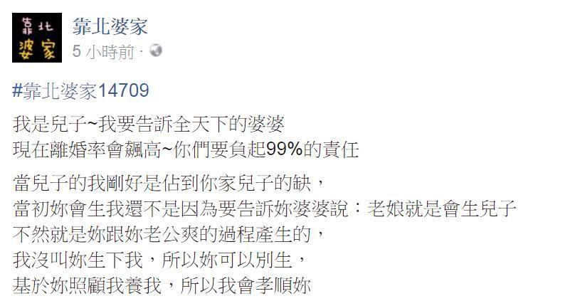 這篇真的講得太中肯!難得有兒子出來打臉自己媽媽(也就是婆婆!)所以說隊友的重要性, 就是必要時刻要出來坦的,看是神隊友還是豬隊友就知道嫁的值不值了! 靠北婆家原文: 我是兒子~我要告訴全天下的婆婆現在離婚率會飆高~ 你們要負起99%的責任當兒子的我剛好是佔到你家兒子的缺, 當初妳會生我還不是因為要告訴妳婆婆說:老娘就是會生兒子 不然就是妳跟妳老公爽的過程產生的,我沒叫妳生下我, 所以妳可以別生,基於妳照顧我養我,所以我會孝順妳 但是重點來啦,我老婆嫁給我妳是不是要互相尊重, 妳沒生她(老婆)沒養她,妳憑甚麼要她對整家人做牛做馬, 當初妳婆婆要求妳虐待妳,那是妳那個時代的封閉觀念, 現在年代改變了,別每天在那邊「跟我以前比很好啦」她是嫁給我不是嫁給妳家, 不爽就支付薪水,進門不是一定要服從, 我跟她一起生活都要互相尊重更何況是妳們, 別她媽的不爽就針對我老婆現在社會講究的是互相, 不是食古不化妳搞我老婆就等於在搞妳兒子 不能接受我老婆就在結婚前嗆說:進我家門嫁我兒子我一定弄死妳不然就別再結婚 後要求東指揮西的,如果覺得我說的不對全天下的婆婆自己檢視一下幾點就知道 一、跟妳有血緣的人睡到自然醒不敢靠背,媳婦睡到自然醒就會酸:媳婦妳下來等吃早餐阿...等等 二、媳婦的孩子吃三小、穿三小妳都要幹涉,我這個做爸的都沒說話了,麻煩妳閉嘴 三、妳女兒結婚就要搬出去住,妳兒子結婚就要一起住,妳哪來的標準 四、妳女兒結婚禮數要照走,妳兒子結婚就對方禮數很多很機歪,妳哪來的標準 五、別一直我對你老婆不錯了,妳對她更好用小姑要求對待她,做兒子也會看在眼裡 六、給妳照顧孩子不是把孩子送妳,就把妳自己的位置放在保母,叫妳別做哪些事情就別做 七、家裡的大大小小事情是平均分攤的,妳媳婦不是瑪麗亞 法律給妳做參考,妳媳婦是排第六~~~第六 上麵那五個關係死光了才會輪到她 如果真的遇到她還在妳身邊顧妳,妳也是各種好事幹盡了我只能說:媽妳有福報 民法第1115條 : (扶養義務人之順序) 負扶養義務者有數人時,應依左列順序定其履行義務之人: 一、直係血親卑親屬。 二、直係血親尊親屬。 三、家長。 四、兄弟姊妹。 五、家屬。 六、子婦、女婿。 七、夫妻之父母。 同係直係尊親屬或直係卑親屬者,以親等近者為先。 負扶養義務者有數人,而其親等同一時,應各依其經濟能力,分擔義務 。 真的把她當家人,妳兒子不是瞎子,我們可以一家和樂的生活下去。 真的把她當仇人,妳兒子不是瞎子,老了她怎麼搞妳妳自己要撐住。 |