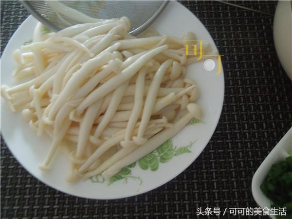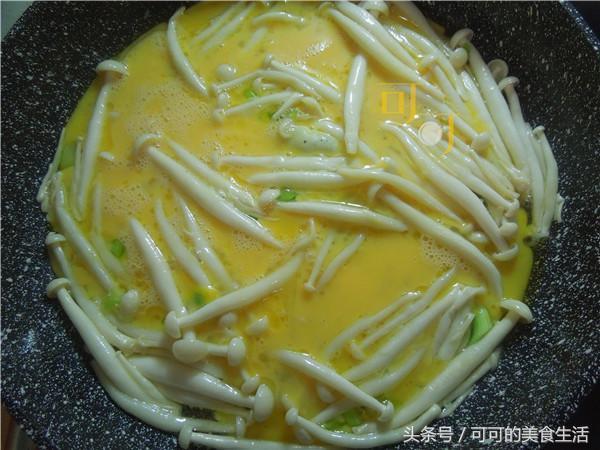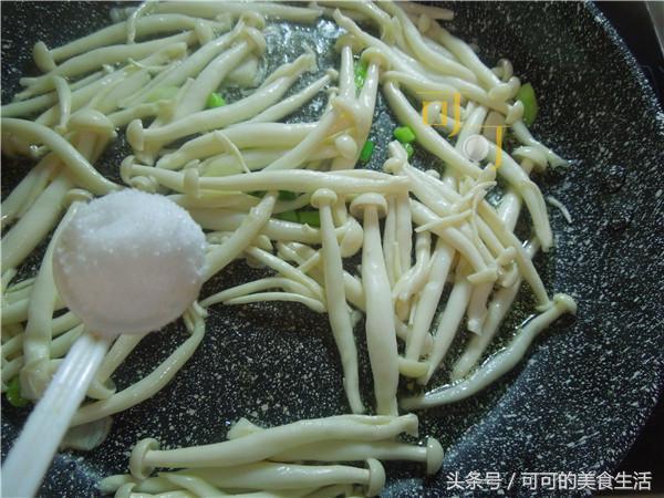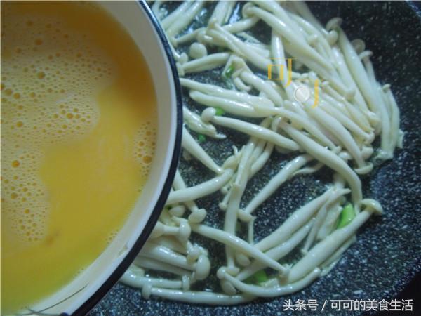 加入焯過水的白玉菇炒出香味來,加一勺鹽(要稍鹹,還要加雞蛋)