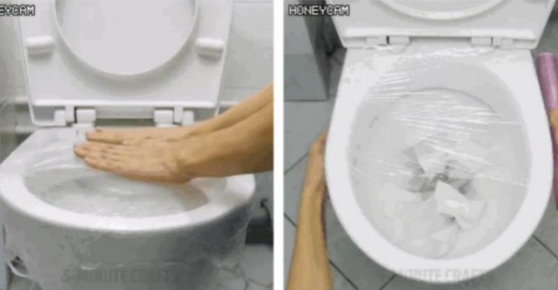 馬桶堵住了,先別急著找人修理。將保鮮膜完全蓋住馬桶,並貼緊邊緣。