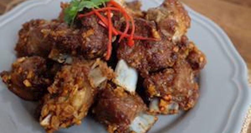 排骨最好選擇肥瘦相間的大排,肉質比較嫩,粉要足夠量,裹勻,油熱後轉中小火炸,以防蒜糊掉。