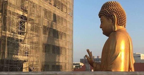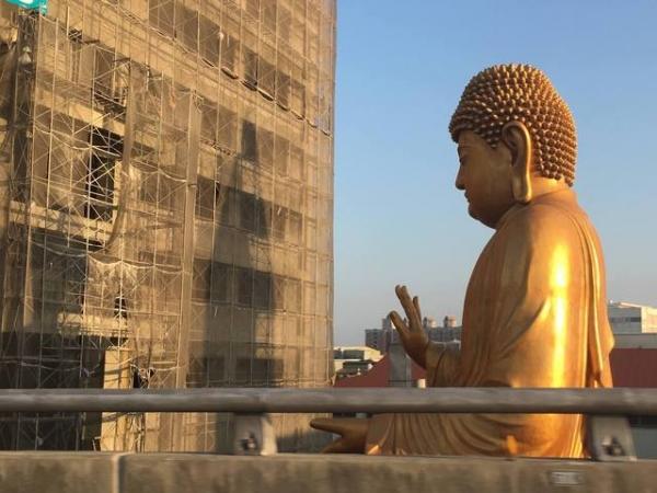 他說「廠商真是用心良苦」為了省空間竟在大樓旁立了一尊金色大佛像,讓住戶24小時貼身感受佛祖保佑,