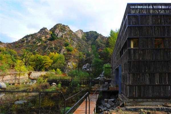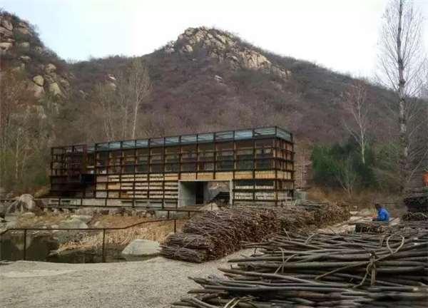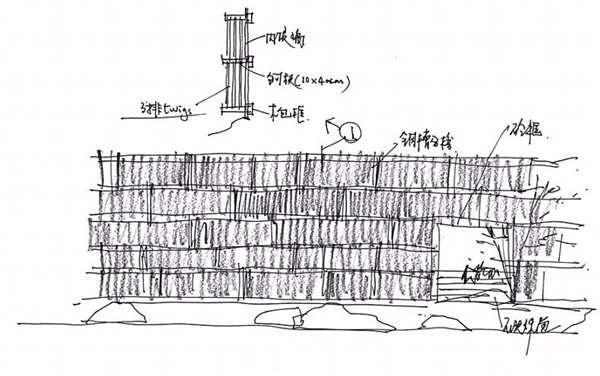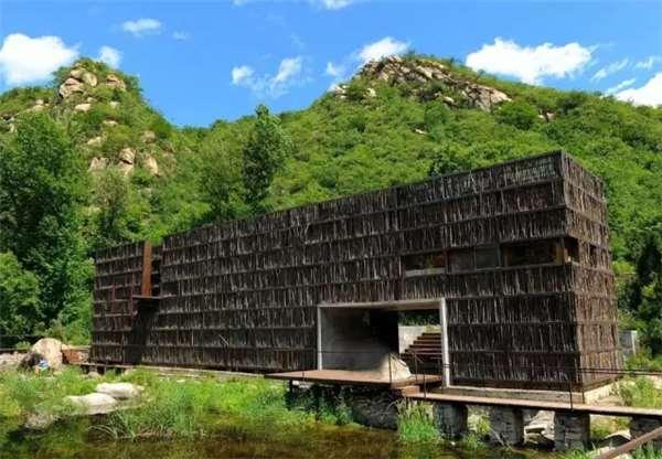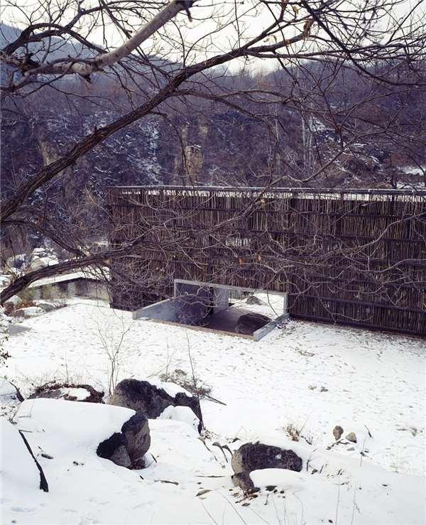 主體結構極為簡單,玻璃與鋼混搭,外牆錯落有致地插滿4.5萬根柴火棍。