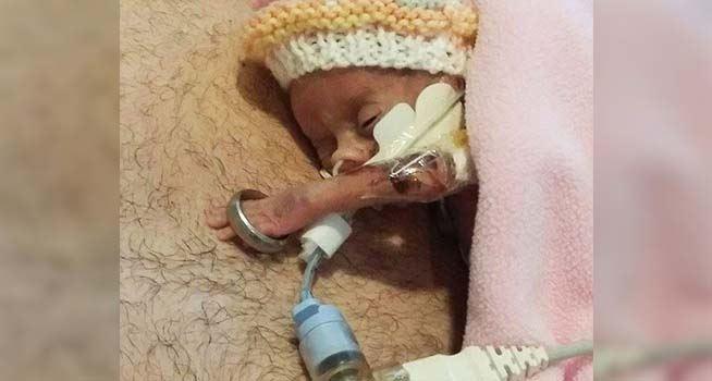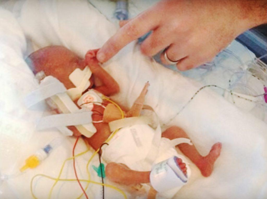 三年前,Stephanie和James Perrin生下了她們的第一個寶寶茉莉(Mollie)。茉莉是個早產兒,七個月就出生,因為在肚子裡的時候換有「胎兒宮內發育遲緩症」,再加上臍帶的限製,茉莉無法正常吸收營養和成長,導致她出生時非常非常小,體重只有470公克,父母將婚戒套祝寶寶的手時,她的手臂甚至整隻都穿了過去。