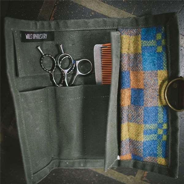 小哥把肩上的箱子放下來打開,裡面裝的都是剪刀,剃刀,梳子,刷子等理髮用的工具。