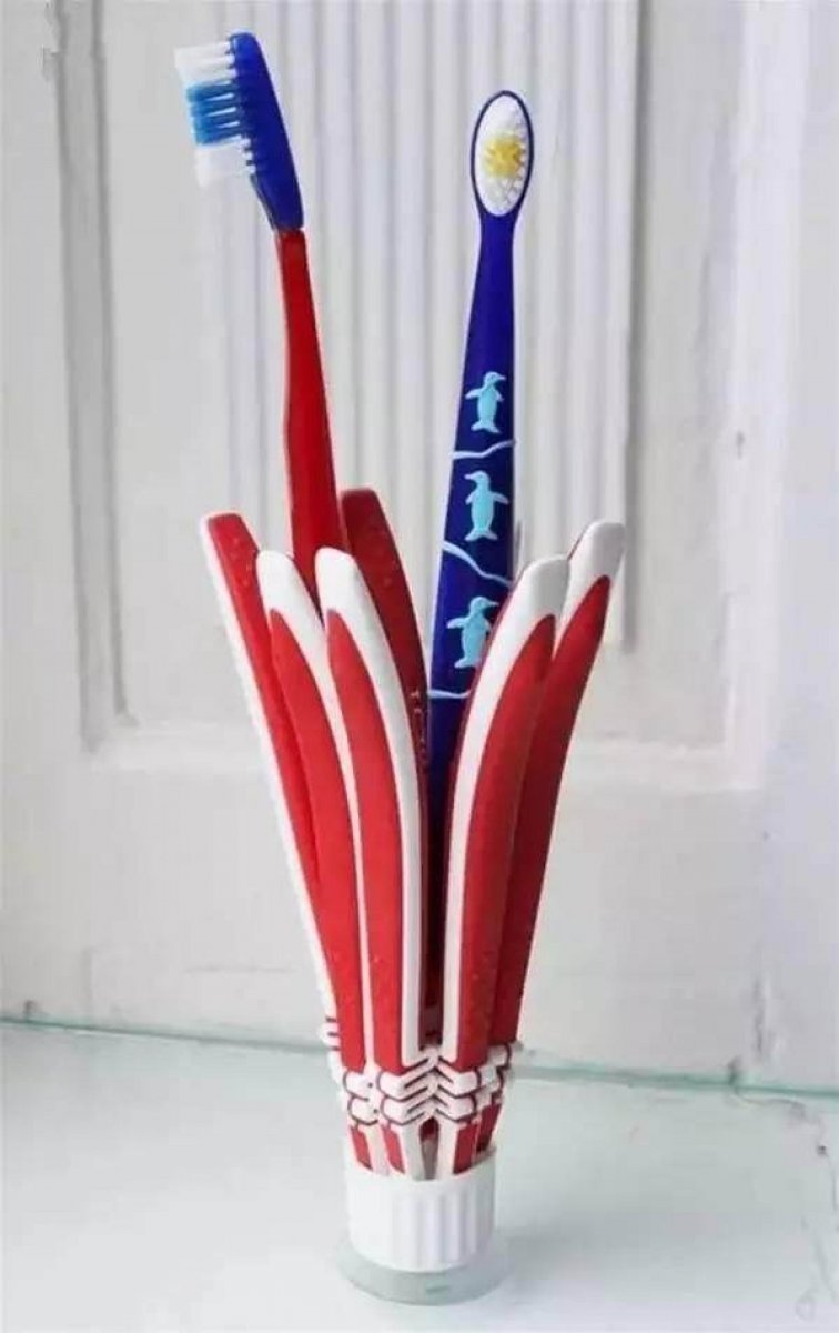 在牙膏蓋的配合下,製作成一個創意十足的牙刷筒。