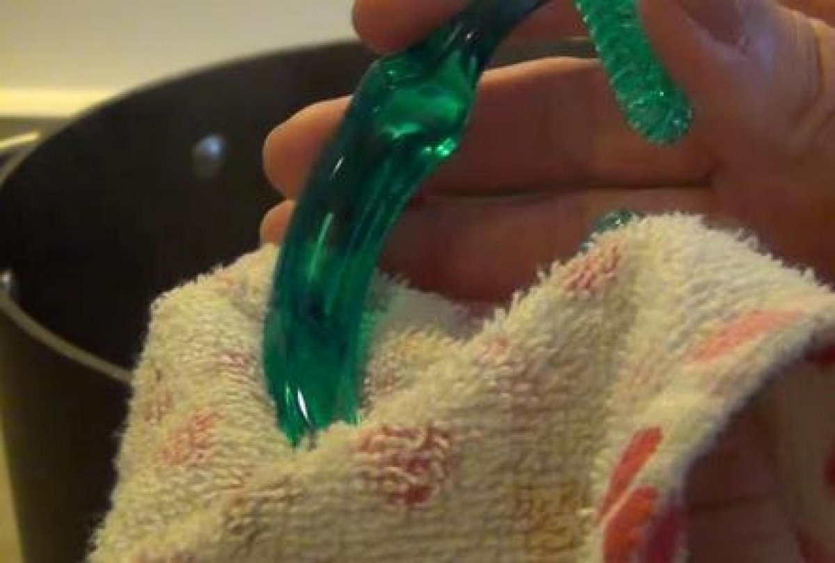 煮一鍋滾燙的熱水,將牙刷放入熱水中煮上10分鐘,待其慢慢變軟後撈起,隔著毛巾用手輕輕扭成手鐲的形狀。