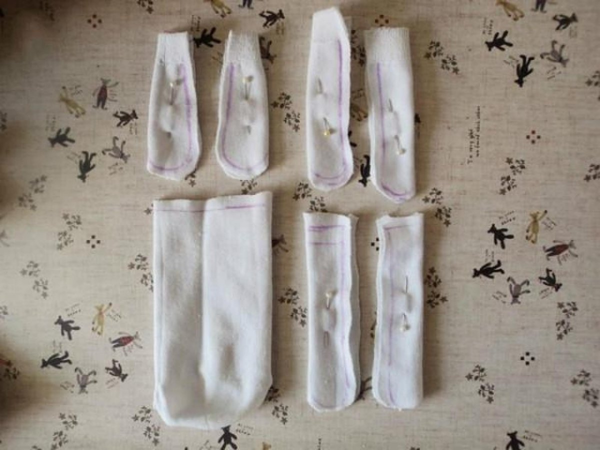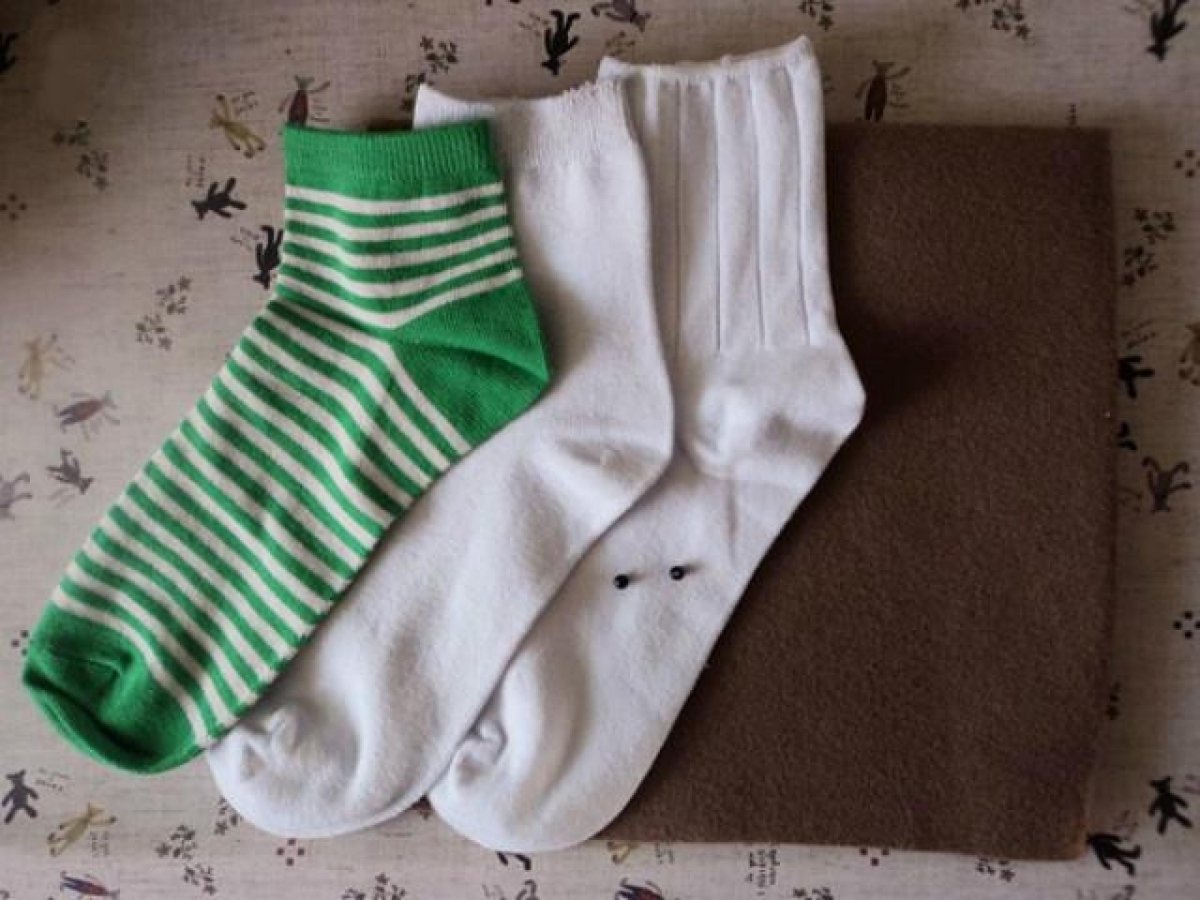 1.需要準備的材料:三隻襪子,兩隻白色的,一隻綠色條紋的。
