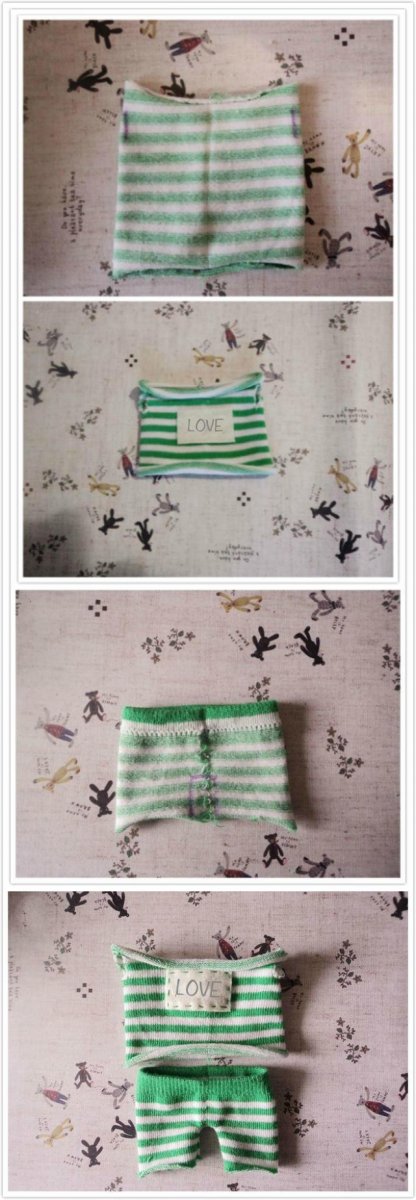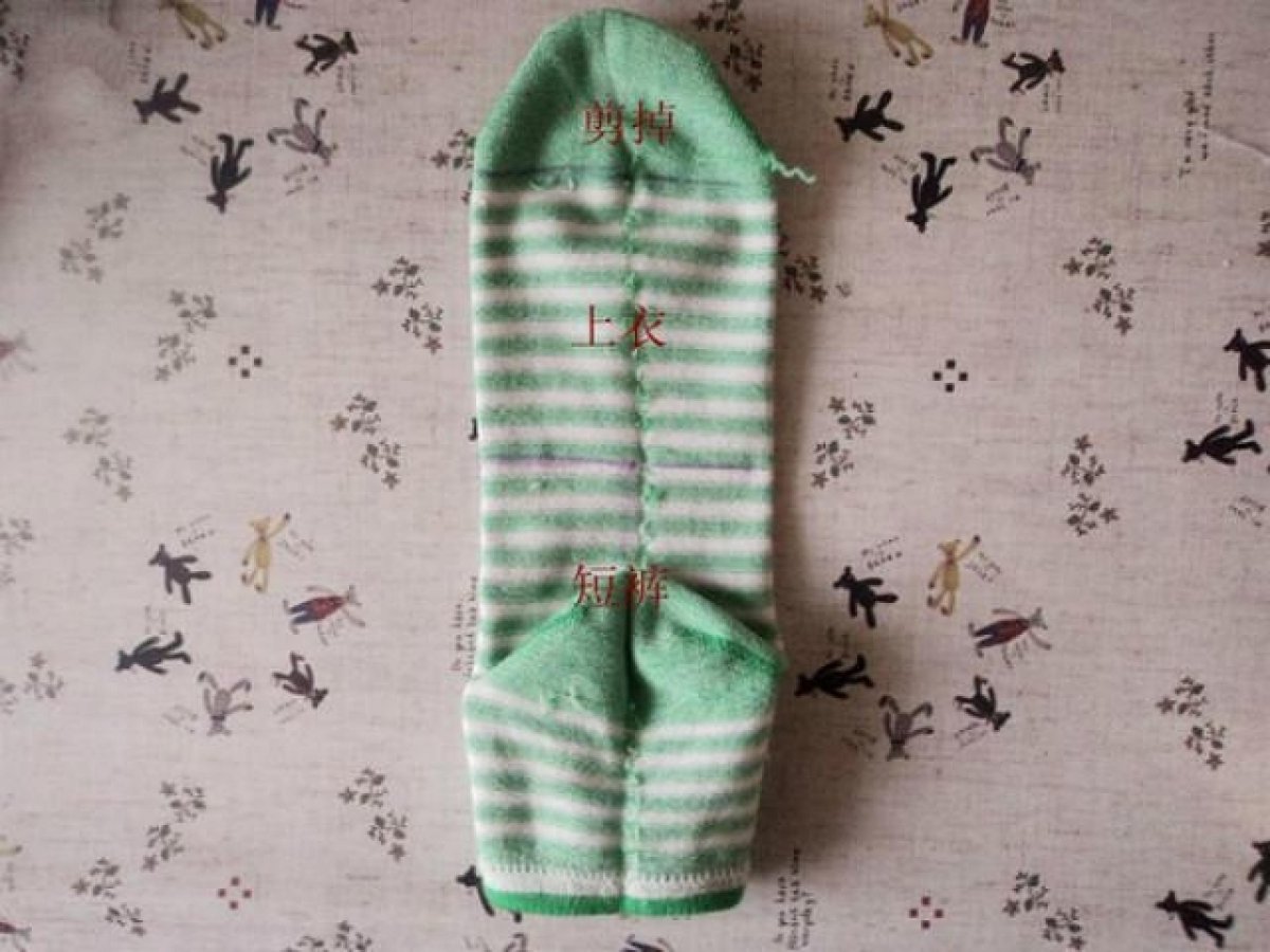 17.將綠色條紋襪裁剪成上衣和短褲。