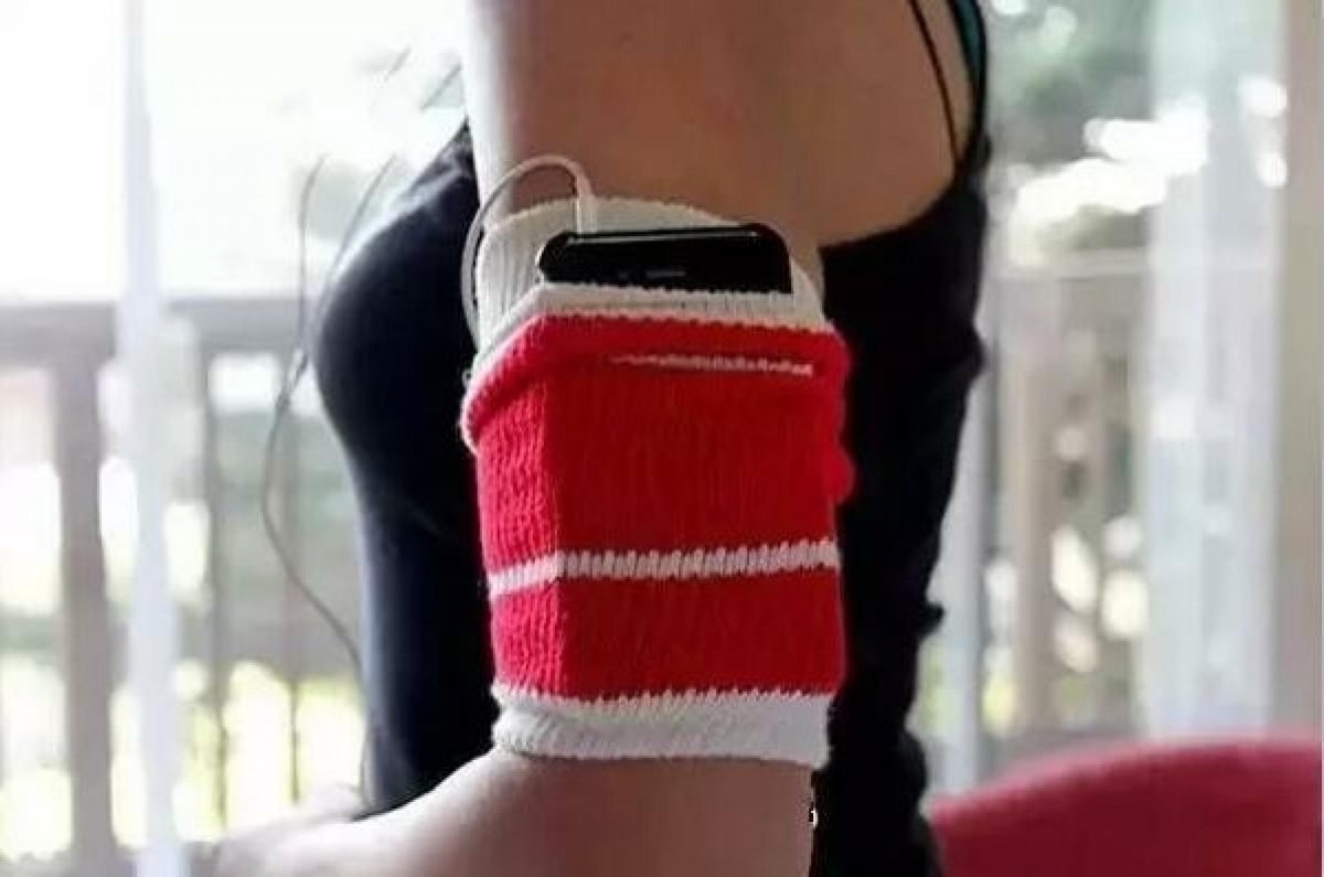 將襪子剪下一截,對摺後套在手臂上裝手機,買運動包的錢都省了。