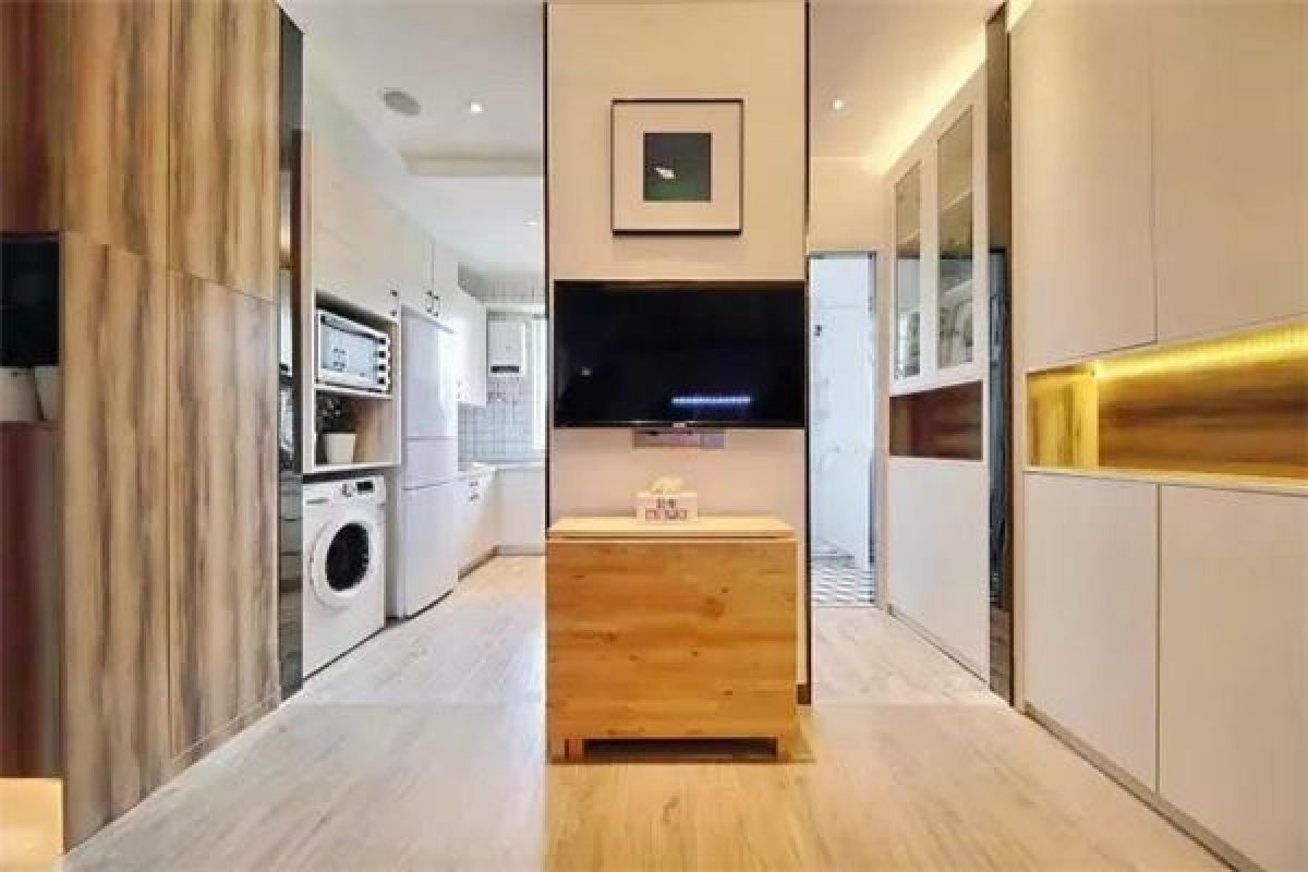 改造後家裝風格集中式與現代簡約於一體,設計師選擇白色主色調進行打造,同時添加灰色、藍色與原木色的裝置和牆麵點綴。