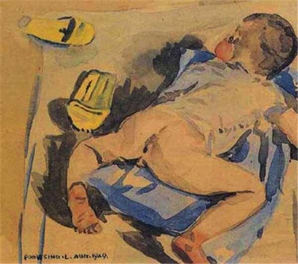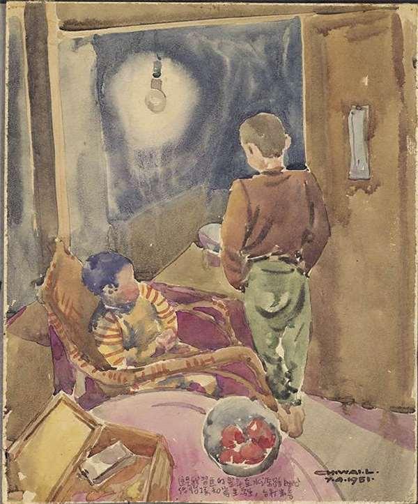 雖然38歲前他從沒拿起過畫筆,但心中畫畫的慾望像小火苗一樣燃燒,立即買來顏料和畫具,看著趴在榻榻米上熟睡的兒子,畫下了人生的第一篇畫作。