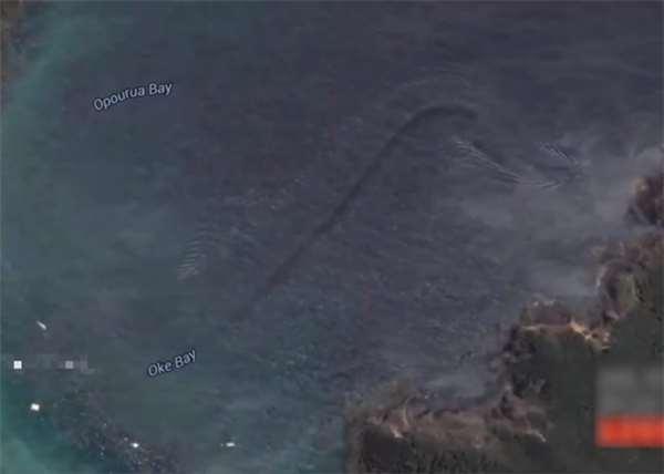 在紐西蘭風光明媚的奧克灣(Oke Bay)海域上,google地圖拍到了一條細長的波痕,這被視為是條約12米長的海洋生物游過的波痕,這個巨大的生物不是鯨魚,牠比鯨魚游的快,也不是鯊魚,因為波痕對鯊魚來說太寬了,所以一定是水下的神秘重量級生物。