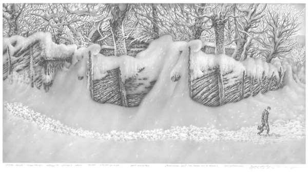 幻想著沒入膝蓋的雪地裡留下了母親的一行腳印,彷彿他可以循著蹤跡找到母親似的,畫紙的上邊,兩旁的大樹被雪壓得彎下來,就像壓在少年的心頭,透不過氣來。
