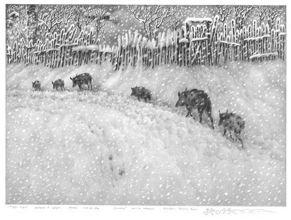 Guram從不理會這些,十多年的反覆練習,小伙子畫畫的功力也到了出神入化地步,他肆意地用手中的鉛筆,畫下風雪天歸家的遊子,描摹下趁著大雪出來找食物的野豬,還有他最喜歡的雪後靜謐的村莊,與雪相對無言,就像整個天地之間就只剩下自己一人......