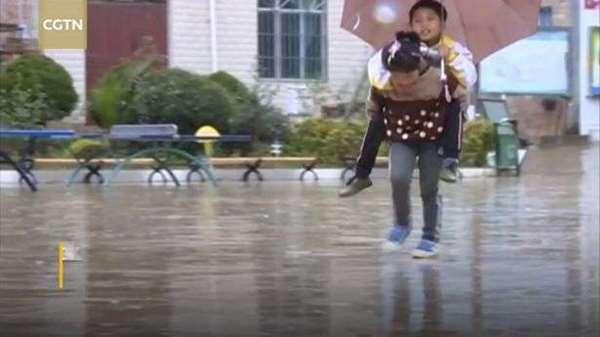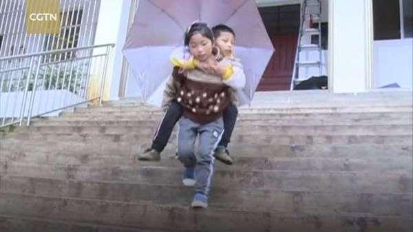 在雲南文山廣南縣黑支果鄉中心學校每天都能看到這個景象,年僅9歲的女孩周定雙背著動不便的哥哥周定富,在教室、宿舍之間往返。