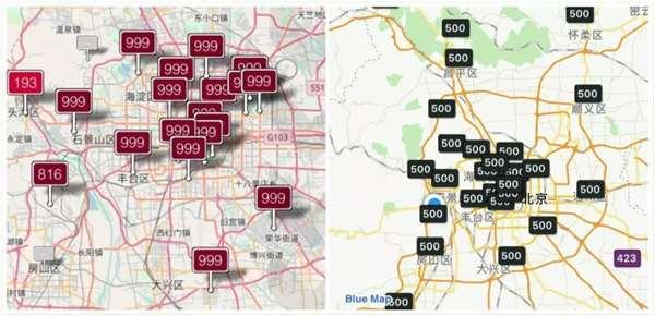 左圖為2018年3月28日北京空氣品質,右圖為2017年5月4日北京空氣,當時的預報數值最高為500,實際已經到達1000-2000。