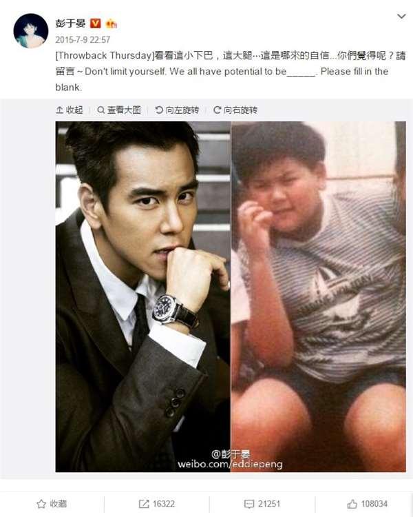 彭于晏生下來就有2500公克重,把媽媽骨盆都壓裂了,小時候他特別貪吃,小學畢業身高只有150公分,體重卻有70多公斤,算是一個小胖弟。