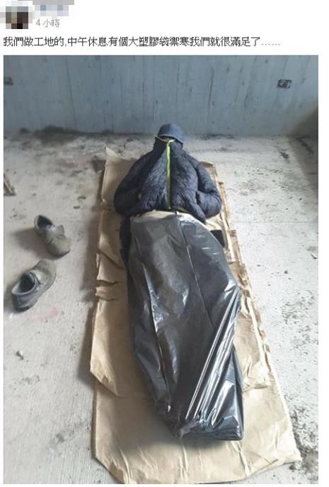 日前就有一名網友在臉書社團「爆料公社」發文感嘆:「我們做工地的,中午休息有個大塑膠袋禦寒,我們就很滿足了……」短短幾句話附上一張在工地裡克難午休被拍下的照片,雖無奈卻也知足。只見一名男子在地上舖了幾張牛皮紙,簡單作為睡墊以不直接接觸到堅硬粗糙的水泥地,就直接席地而躺午睡休息了。
