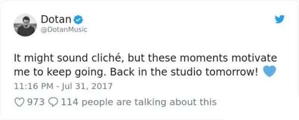 謝謝你邀請我們去演唱會!我倆秋天一定會去的!請繼續創作美好的歌曲,請繼續保持這種謙虛喲~