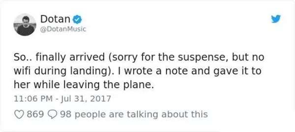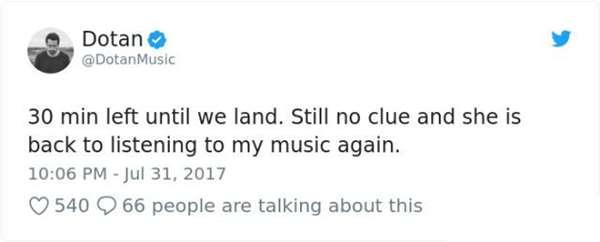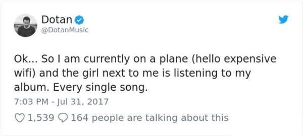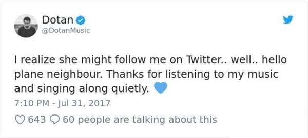 我覺得她可能在推特上關注了我…你好啊,我飛機上的鄰座。謝謝你聽我的音樂,謝謝你的輕聲哼唱。