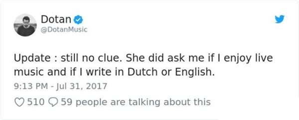更新:她還是沒認出來,不過她問我愛不愛看音樂會現場,問我平常寫歌用英文還是荷蘭語。