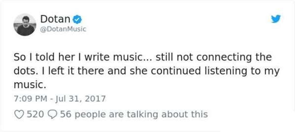 在他嘗試暗示她多次未果後,他開始在推特上,跟自己的2萬多粉絲直播起了這段被女粉絲視而不見的經歷。