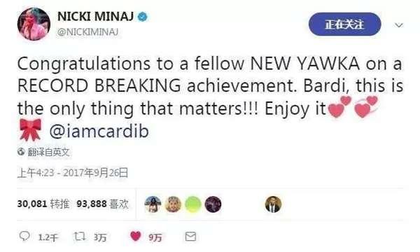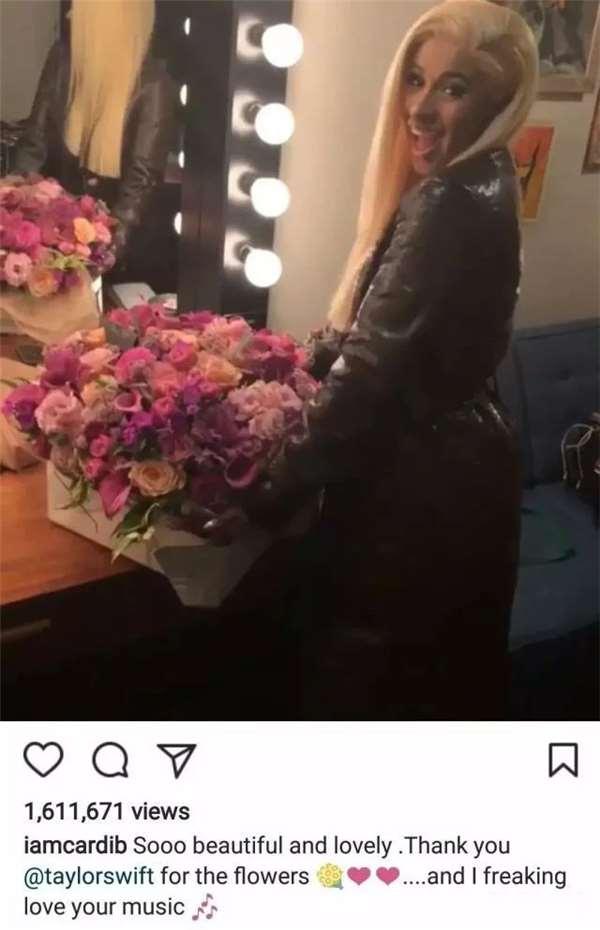 登頂之後,許多藝人都為Cardi B的成就感到高興,紛紛送上了祝福,其中包括饒舌天后妮姬米娜,還有剛剛被擠下去的泰勒絲。