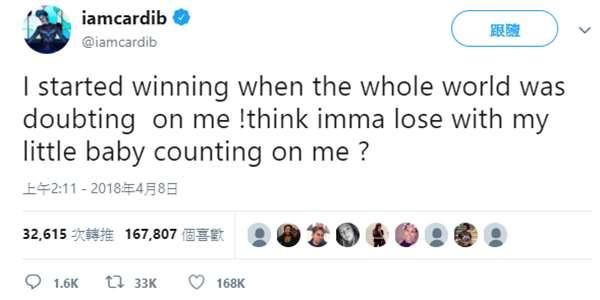 隨後,Cardi本人也發推特承認自己懷孕,言語之中依然充滿著霸氣。