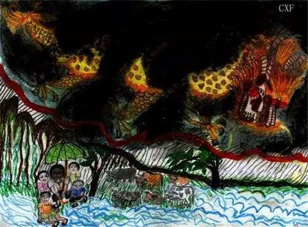 暴雨中的常秀峰奶奶和四個小孩子