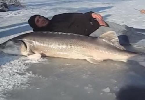 這條魚在眾人的幫助下終於是從冰水下麵拉了出來。這名男子還躺下來跟這隻魚對比了一下,發現這隻魚的長度差不多有男子的身高那麼長了,重量有一個小孩子那麼重。其實這條大魚是一條鱘魚,是一種非常古老的物種,而且目前這種魚加拿大的數量也並不多,賣價好像是500萬一斤,都能買輛蘭博基尼跑車了。