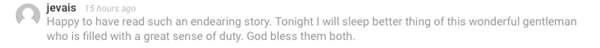 「很高興聽到這樣的故事,今晚我會因為這個充滿責任感的好男人而睡得很好,上帝保佑你們。」