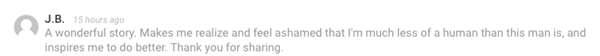 「這個故事太棒了,讓我感覺到無比的慚愧,我和Jimmy相比實在是差太多了。他激勵了我讓我做更好,謝謝你的分享。」