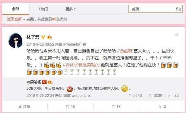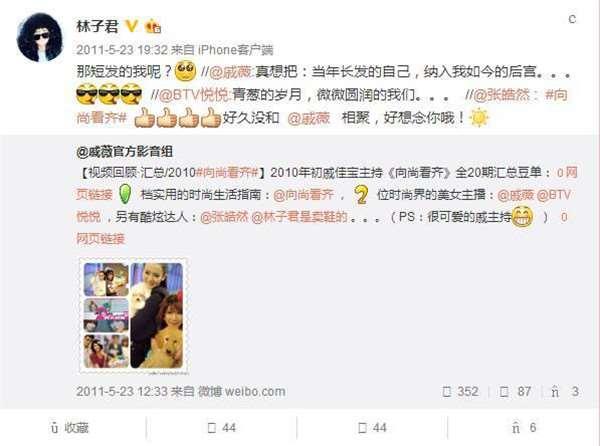 從2010年開始,兩人微博互動就異常頻繁,林子君在微博上曾不止一次的稱呼戚薇為「女神」