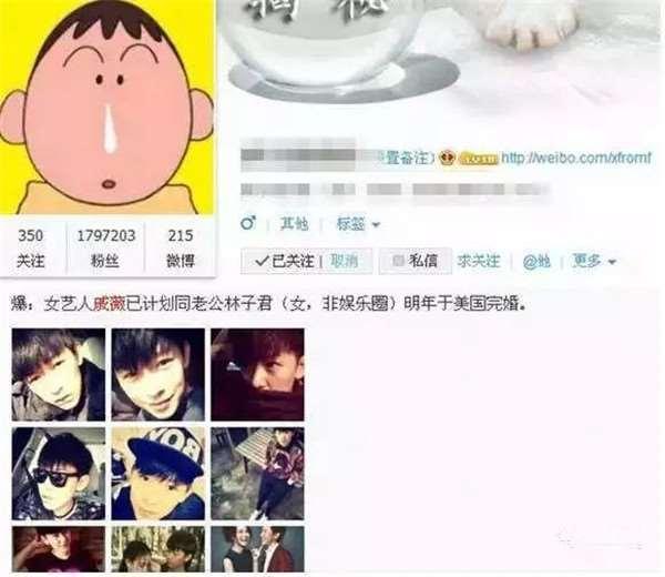 沒結婚之前她和林子君疑似同性戀的新聞就被炒得沸沸揚揚,還有部落格爆料,戚薇和老公林子君(女)計畫2014年於美國完婚。