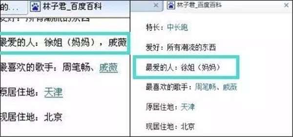 就在李承鉉和戚薇公開戀情之後,林子君迅速把百度百科中「最愛的人」一欄去掉了戚薇