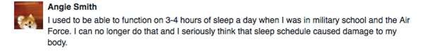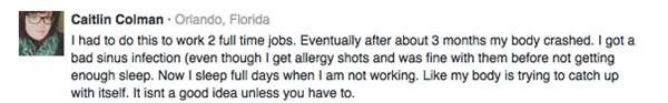 「我不得不兼職做兩份工作,大約三個月的時間我身體就垮了。我得了鼻竇感染,雖然很快就治療了但是我覺得就是因為睡眠不足引起的。所以除非是你不得不這樣,最好還是不要嘗試了。」